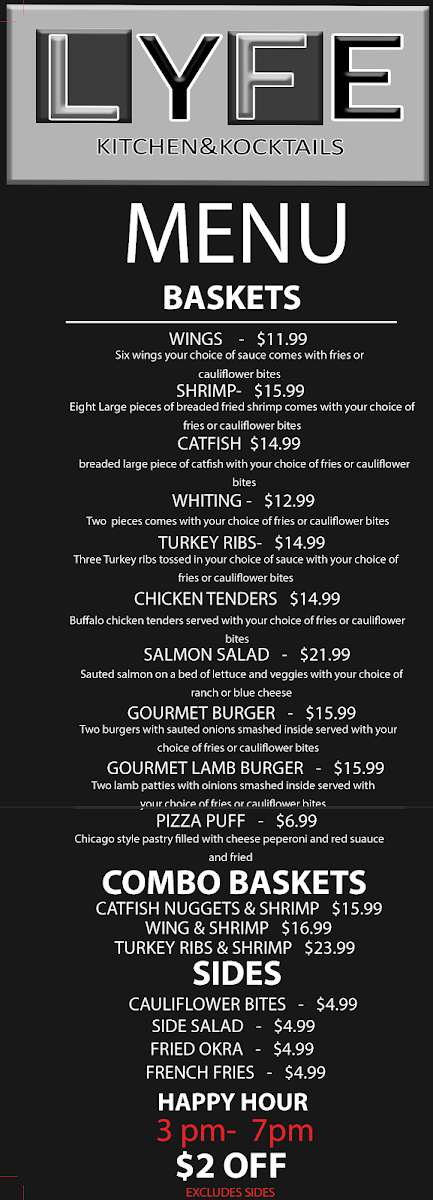 If you’re looking for a spot where comfort food meets an easygoing vibe, the Lyfe Kitchen And Kocktails Menu is worth exploring. Nestled at 1536 N Cassady Ave in Columbus, this place serves up soul-inspired dishes that feel both familiar and fresh. From crispy fried catfish and creamy mac and cheese to wings glazed just right, every bite carries that home-cooked satisfaction people crave. Their sides alone could steal the show - think collard greens, candied yams, or cornbread with that perfect touch of sweetness. And since it’s not just about the food, the drink list adds a smooth rhythm to your meal, with cocktails that balance flavor and flair. Whether you’re dropping by for a relaxed lunch or winding down the evening with friends, it’s the kind of menu that invites you to take your time and enjoy every plate that hits the table.